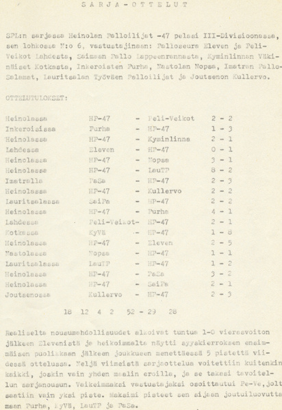 | Heinolan Palloilijat -47 | 18 | 12 | 4 | 2 | 52-29 | 28 |